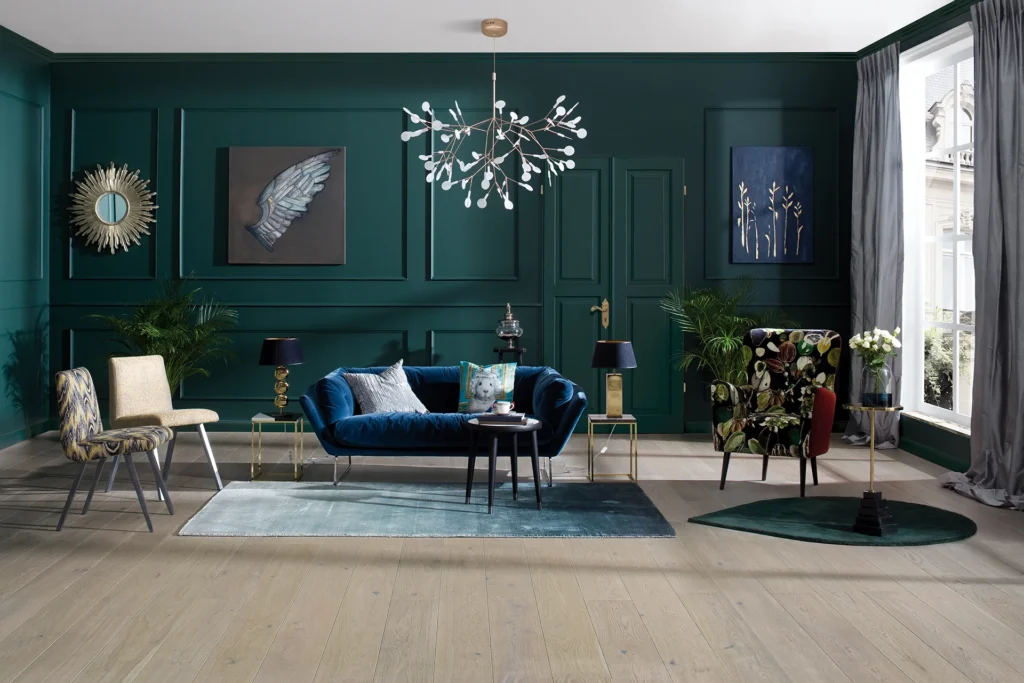 Бутылочная зелень на стене в последнее время является одной из самых популярных тенденций в дизайне салона. Глубокий, красивый цвет успокаивает, расслабляет и при этом выглядит действительно впечатляюще. Кроме того, зеленая стена в гостиной хорошо сочетается с мебелью в различных стилях. Растительный оттенок хорошо смотрится в минималистских и классических интерьерах. Он также интересно сочетается с этническими и растительными аксессуарами.