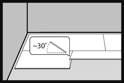 18. Первую гибридную доску во втором ряду пола вставляем под углом примерно 30° в замок доски первого ряда.