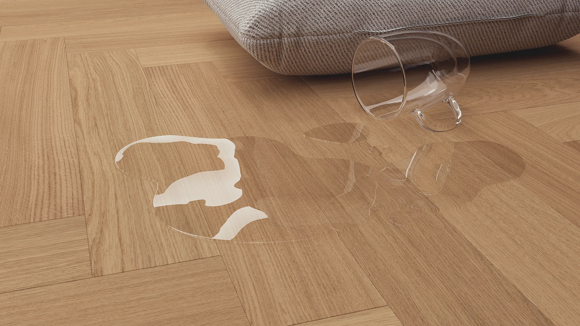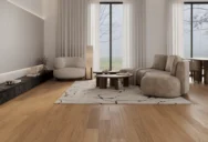 Дубовый пол в классическую ёлочку с нежным кремовым оттенком привносит в интерьер тепло и гармонию. Светлая древесина визуально освещает пространство, а щётчатая фактура подчёркивает природный рисунок годичных колец.