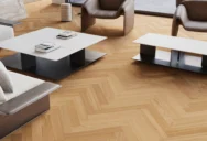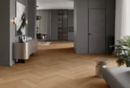 Дубовый пол в классическую ёлочку в прозрачном покрытии сочетает утончённую элегантность с природным характером древесины.