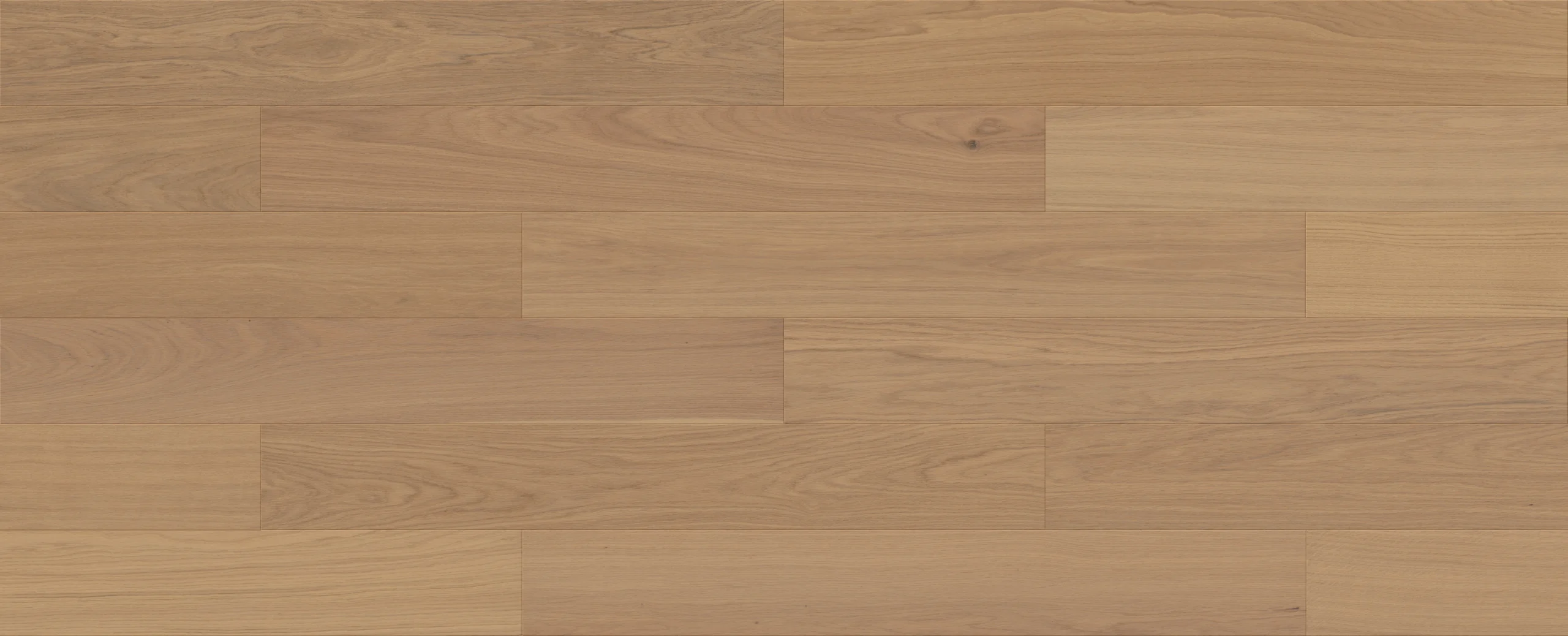 Дубовый пол в лёгком бежево‑пепельном оттенке сочетает современную утончённость с природным характером древесины. Нейтральный, сдержанный цвет создаёт элегантный фон, подходящий для многих стилей интерьера.